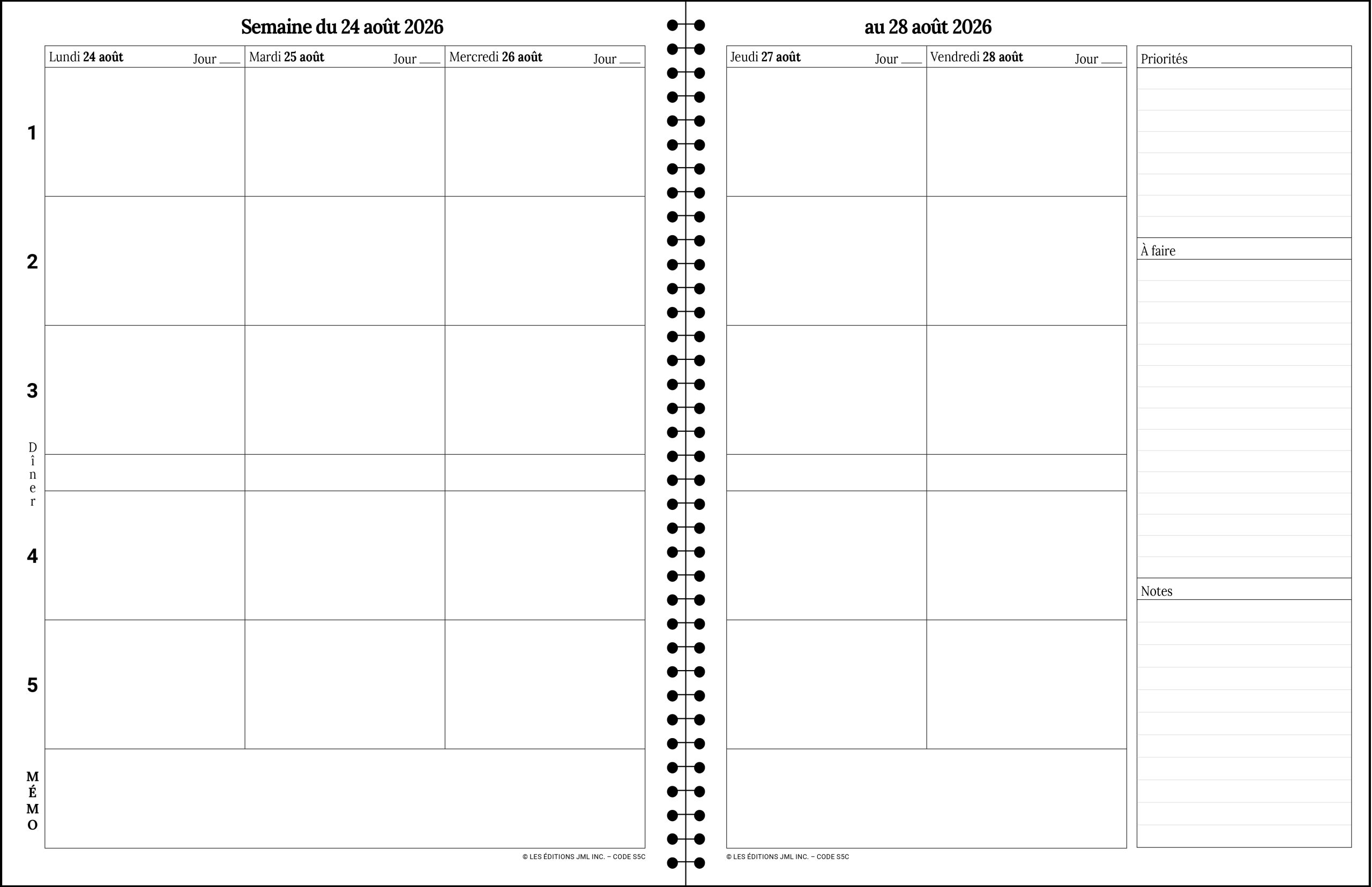 Semainier à 5 périodes avec dîner, daté du 24 août 2026 au 2 juillet 2027, avec relevé de notes pour 1 seul groupe d’élèves/4 sections, 3 acétates supplémentaires, 10 feuilles lignées et 1 pochette de vinyle. Il permet une préparation de cours pour 5 périodes par jour avec espace pour le dîner. Il offre une vue d’ensemble de la semaine sur 2 pages. Il inclut un relevé de notes conçu pour recueillir les résultats d’un seul groupe d’élèves divisé en 4 sections.